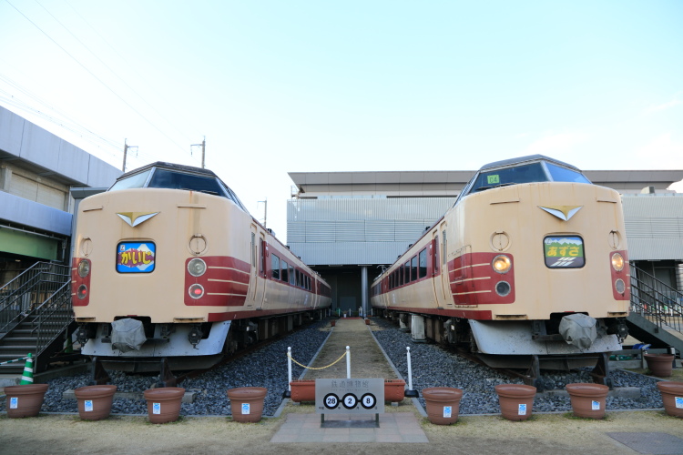 屋外に「休憩所」も兼ねて置かれている特急「かいじ」「あずさ」の車両。