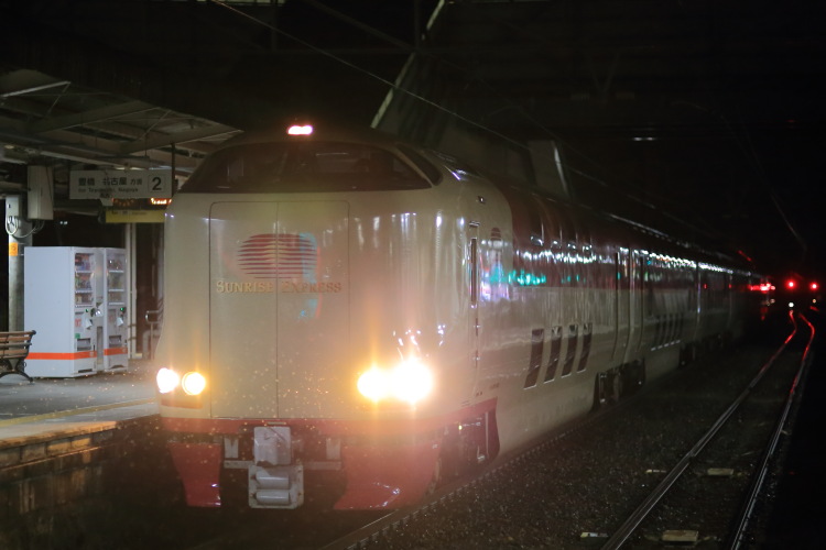 新居町を通過するサンライズ(深夜1:20)